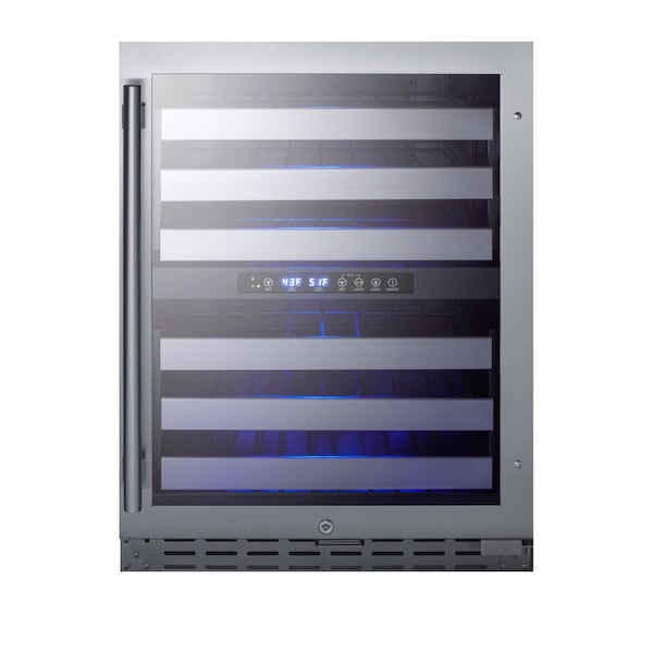 Summit's extensive selection of built-in undercounter wine cellars includes ADA compliant choices with versatile designs for residential or commercial use. The ALWC532CSS is a dual zone wine cellar that is ETL-S listed to NSF-7 commercial standards. The front-breathing design allows built-in installation, while the fully finished stainless steel wrapped cabinet also enables freestanding use. Sized just under 32 inches high and 24 inches wide, this unit makes an ideal fit under lower ADA compliant counters. The user-reversible double pane tempered glass door features a seamless stainless steel door trim and pro style handle in stainless steel. A factory-installed lock offers added security and a stainless steel kickplate completes the look. Inside, the ALWC532CSS is designed to store up to 46 standard Bordeaux style bottles, or a combination of 30 Bordeaux and 16 wider Burgundy bottles. The digital control panel allows you to manage the upper temperature chamber between 41 and 50 Degrees F for white wine, while the lower zone is designed to store red wine between 50 and 64 Degrees F. Six full-extension black wire shelves with stainless steel front trim move out smoothly on ball-bearing glides for easy loading. Both compartments include recessed LED lighting in a gentle blue hue for an attractive and efficient presentation. With its advanced user features and versatile design, the ALWC532CSS makes a great addition to any ADA compliant setting looking to store wine in modern style. This unit can be paired with the ALBV2466CSS for a matching set.