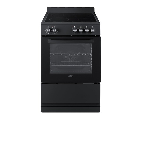 Summit's innovative series of European-made ranges offers full cooking convenience for apartments, ADUs, tiny homes, and other settings with limited kitchen space. Made in Europe, the REXT24BL is a 220V electric range sized at just under 24in wide with a depth under 24in making it ideal for L or U-shaped kitchens. For safer heating and easier clean-up, these units feature a smooth glass cooking surface. There are two 6in burners and two 8in burners to ensure the REXT24X can accommodate various cooking needs. The versatile design includes a removable 2in high matching backguard, allowing you the choice of a standard range style or a slide-in look with a flat surface that allows you to better integrate the unit with your own backsplash design. For added space savings, the REXT24BL features a slide-out drawer, perfect for storing your pots and freeing up more kitchen space. Inside, the REXT24BL features a large 2.44 cu.ft. oven made from durable porcelain enamel and includes two sliding wire racks with five positions to let you fit various dish sizes. The large oven window provides a full view of your cooking, with an interior light that automatically turns on with the oven. The oven door is constructed from low-e glass in black for a modern look, with a sleek black finish on the cabinet, storage drawer, and manifold. The REXT24BL comes with multiple cooking functions to cater to various cooking methods. The oven settings include: defrost, static cooking, convectionfan, broiling, and even a broiling + convectionfan function. All cooking controls meet ADA guidelines since each is located upfront, eliminating the danger of reaching across the cooktop surface. For this unit in stainless steel or white see models REXT24SS and REXT24W. For a 20in wide unit, see model REXT20BL. Browse our website to view our complete collection of ranges and cooking appliance at summitappliance.com.