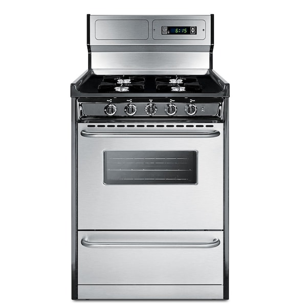 Summit Appliance offers a wide selection of American-made household ranges built for long-lasting durability in space-challenged kitchens. The TNM6307BKW is 24in wide apartment-sized gas range with a generous 2.92 cu.ft porcelain oven interior that can fit large trays. Two adjustable oven racks are included. An oven window and on/off interior light allow you to easily keep watch over your cooking. The broiler is located below the oven in a drop-down compartment. Four open 9000 BTU gas burners accommodate most of your stovetop heating needs, with upfront push-to-turn knobs that let you adjust your cooking without reaching over hot burners. This unit utilizes an electronic ignition system for added safety. Stainless steel doors feature professional style towel bar handles, bringing classic elegance to smaller kitchen spaces. The deluxe 8in high backguard includes a digital clock and timer for added convenience when cooking. This unit has a recessed oven door and is conveniently sized at just 24in deep for a better fit in galley in L-shaped kitchens, where every inch counts. With its classic style and quality construction, Summit's made in the USA cooking line offers reliable cooking for smaller homes. Additional choices are available in 20in, 30in, and 36in wide fits. This unit ships ready for natural gas connections. To use with propane, add the Kit LP.