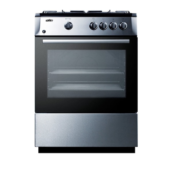 SUMMIT PRO24G is a 24in wide gas range with deluxe features and a unique European design. Designed and constructed in Europe, the PRO24G uses electronic ignition and includes four sealed Sabaf burners, with a waist-high broiler located inside the oven for cooking convenience. The cooking surface is jet black, with two sets of continuous grates in a matching finish and a curved stainless steel manifold for a modern look. This 'slide-in' style range comes without a backguard, allowing you to integrate the unit into your own kitchen setup. Alternatively, we offer a 10in high backguard in stainless steel as an accessory for this unit some assembly required. For this option, see the BG24. The PRO24G has a black trimmed oven door with a pro stainless steel handle and a window for easy monitoring. The oven includes a light and two slide-out racks with five positions to allow more flexibility in baking and broiling. A drop-down storage compartment offers added convenience. At 24in wide, the PRO24G is ideal for apartments and other small kitchens looking to add a touch of style in a slim-fitting size.