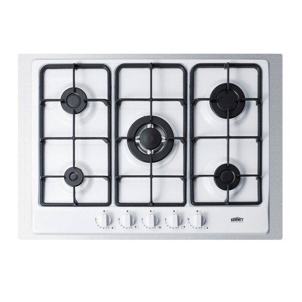 Made in Italy for SUMMIT, our deluxe gas cooktops offer the ideal cooking experience for modern kitchens. The GC5271WTK30 comes with an enamel steel surface in a classic white finish, with color-matched knobs centrally located for easy use. The cooktops is uniquely sized at 27in wide, but ships with a stainless steel trim kit that allows the cooktop to be placed in standard 30in wide counter openings. Continuous cast iron grates are designed to hold up to heavy duty pots and pans, making it easy to side cookware from one burner to another. This unit is equipped with thermocouple flame failure protection to ensure gas will turn off if the flame is extinguished. It utilizes electronic spark ignition and comes with a pre-installed 115V power cord. For added safety, the knobs require a gentle push-to-turn motion to ignite. Five sealed Sabaf burners provide a range of cooking power to help accommodate a variety of heating needs. The center ultra rapid 11,000 BTU burner includes a dual flame and removable cast iron wok stand to offer more even heating for large cooking vessels. The right rear burner offers a 10,000 BTU cooking performance, ideal for boiling pots of water or cooking large dishes. The front right and rear left semi-rapid 6,100 BTU burners meet most general cooking needs, while the auxiliary 1,200 to 3,550 BTU front left burner allows you to achieve more precision in gentle heating. The GC5271WTK30 comes preset for natural gas operation. We include a conversion kit that lets you adjust for LP gas connections. This unit is also available in black GC5272BTK30 and stainless steel GC527SSTK30.