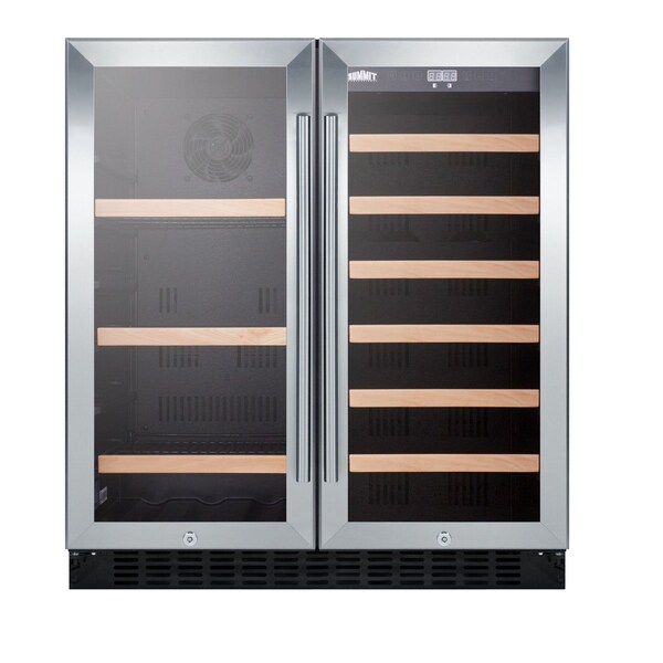 SUMMIT's collection of built-in undercounter wine cellars offers quality storage with user-friendly convenience and elegant style. The SWBV3071 is a 30in wide wine and craft beer cooler designed for built-in installation under counters. The fully finished black cabinet also allows freestanding use. This unit includes two stainless steel trimmed glass doors with a unique French door swing. Both include factory installed locks and professional handles. Front locks offer keyed security for both compartments. The sealed back design ensures easier cleanability. Two separate zones feature independent digital thermostats, allowing you to store craft beer or white wine in the left side while preserving your red wine in the right. The left beverage compartment includes three slide-out black wire shelves with wooden trim to match the six wooden shelves included in the right. Both sections feature a slotted floor to hold additional bottles. The digital control panel features an LED temperature readout in Celsius or Fahrenheit. Recessed LED lighting in a white hue offers an attractive and efficient presentation. With its attractive style and user-friendly features, the SWBV3071 is a great addition to any home looking to bring versatile beverage storage under the counter.