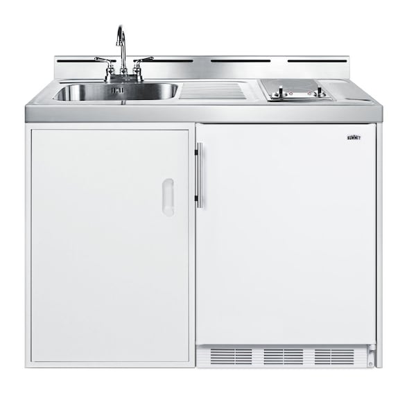 Summit brings true convenience to smaller spaces with all-in-one combination kitchenettes. Available in a variety of sizes and finishes, these units come fully featured with everything you need for the home foodservice experience, including a 2-burner coil cooktop, sink, storage cabinet, and refrigerator with a freezer compartment. The C48ELGLASS is our deluxe combination kitchen in a full 48in width. At 24in deep, it leaves you plenty of room to navigate while preparing food on two 120V smooth glass top burners. SUMMIT CT661W, one of our most popular compact refrigerator-freezers, slides in under the counter. This unit uses SUMMIT's exclusive dual evaporator cooling, for energy efficiency with quality results. Automatic defrost eases maintenance in the refrigerator section and a manual defrost zero degree freezer keeps even ice cream frozen. Adjustable glass shelves, door storage, a scalloped wine shelf, and a crisper provide added storage options. A side cabinet provides ample space for dry storage. This unit includes a stainless steel work surface with a sink and faucet. Our all-in-one combination kitchens ship fully assembled in two boxes. Just slide the refrigerator in and start serving. Perfect for studio apartments, hotel rooms, dormitories, assisted living facilities, and any other location in need of a full kitchen area at one great price.