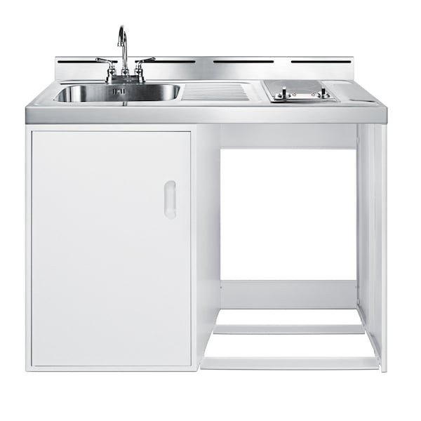 - Includes a 2-burner cooktop, sink with faucet, storage cabinet, and opening to accept a 24" wide refrigerator or dishwasher (not included)