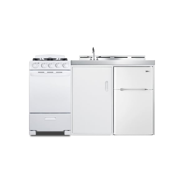 Summit's line of all-in-one combination kitchenettes brings complete kitchen convenience in a slim-fitting design. These units come fully featured with everything you need for the home foodservice experience, including a refrigerator with a freezer compartment, 4-burner gas range with oven, sink with faucet, cutlery bin with a removable cutting board cover, and storage cabinet for dry goods.