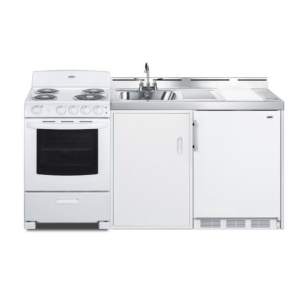 Summit's line of all-in-one combination kitchenettes brings complete kitchen convenience in a slim-fitting design. These units come fully featured with everything you need for the home foodservice experience, including a refrigerator with a freezer compartment, 4-element electric coil cooktop with oven, sink with faucet, cutlery bin with a removable cutting board cover, and storage cabinet for dry goods.