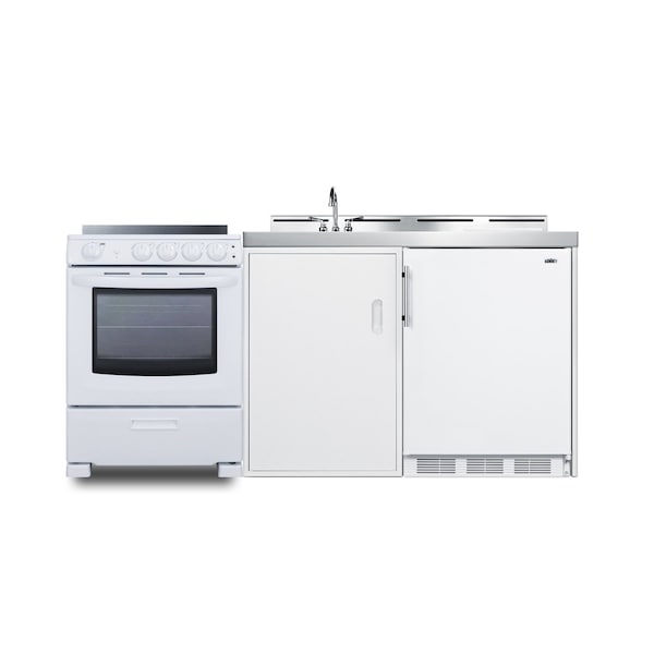Summit's line of all-in-one combination kitchenettes brings complete kitchen convenience in a slim-fitting design. These units come fully featured with everything you need for the home foodservice experience, including a refrigerator with a freezer compartment, 4-burner smooth top range with oven, sink with faucet, cutlery bin with a removable cutting board cover, and storage cabinet for dry goods.