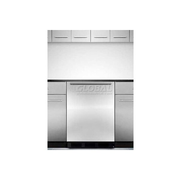 Summit built-in undercounter all-refrigerator, s/s door, black - ff7bbisshhada summit's ff7biada series features commercially approved all-refrigerators with ideal dimensions that offer maximum storage capacity in a slim fit. The ff7bbisshhada is cable of built-in installation or freestanding use, with a convenient width under 24 inches. It has a 32 inch height that fits under lower ada compliant counters. The black cabinet is fitted with an elegant stainless steel door complete with sleek handle set horizontally across the top. Inside, the ff7bbisshhada uses automatic defrost to lower user maintenance. Summit's unique "hidden" evaporator is set behind the rear wall, creating a seamless interior that's easy to clean. The generous storage capacity can accommodate large trays with dimensions of 19 1/2" x 16." adjustable glass shelves and a reversible door add flexibility. A rocker switch to turn the interior light on and off is located just behind the adjustable thermostat for additional convenience.user-friendly and energy efficient, the ff7bbisshhada fits well in any commercial, home, or medical setting. Match it with any frost-free scff55bada freezer for a complete side-by-side set.
