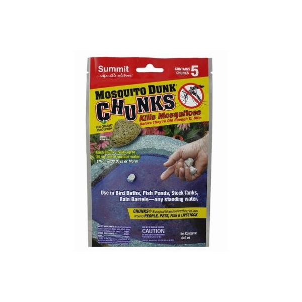 Mosquito Dunk Chunks. 5 Chunks per pack. Controls for 5 months 30+ days per chunk. Convenient for bird baths rain barrels stock tanks and more anywhere water stands.No mixing or measuring. Each Chunk covers up to 25 sq. ft. of surface water.