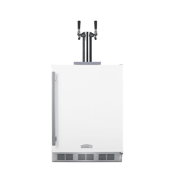 Summit Commercial brings unique appliance choices to ADA compliant settings with a new line of commercial coffee dispensers made in Europe. Sized at 32 inches high, the SBC58WHBIADACFTWIN is designed to fit under lower ADA compliant counters. The front-breathing design allows built-in installation, while the fully finished cabinet also enables freestanding use. This unit comes in a clean white finish accented by a stainless steel kickplate and pro style handle. We include a removable two-piece stainless steel drip tray for cleaner service. This unit ships with an NSF-listed stainless steel tap kit that includes everything you need to serve iced coffee, including a standard dual tap draft tower, regulator, and nitrogen tank. Inside, the SBC58WHBIADACFTWIN is designed to hold two 1/6 sixtel kegs note: interior does not accommodate a standard half barrel. Automatic defrost ensures easy user maintenance, with a seamless interior for easier cleaning. The stainless steel floor offers added durability when loading kegs. This unit includes an interior light with an on/off rocker switch and a dial thermostat for easy and intuitive temperature management. The nitrogen tank bracket is located inside, allowing you to keep the tank inside and save on exterior depth. The SBC58WHBIADACFTWIN is ETL-S listed to NSF-7 commercial standards. Additional ADA compliant European kegerators are available with stainless steel, panel-ready, or glass doors, as well as alternate tap kits for nitro-infused coffee and kombucha. Browse our complete line for more choices.