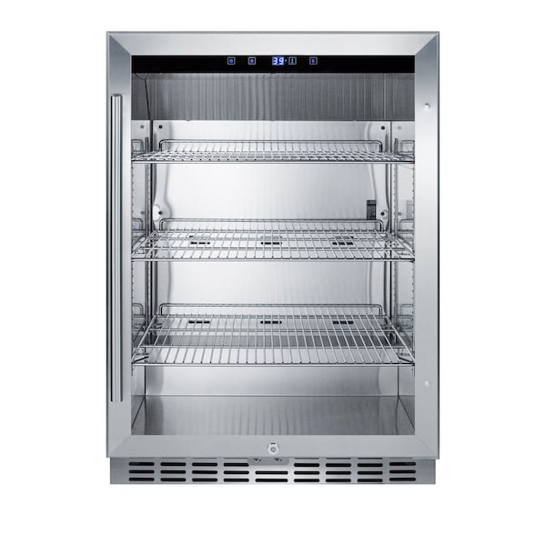 Summit Commercial's line of outdoor appliances includes built-in undercounter display refrigerators designed for optimum storage and product presentation. The SCR611GLOS is a commercial outdoor beverage center that is ETL-S listed to NSF-7 standards. The weatherproof design features a 304 grade stainless steel wrapped cabinet and sealed back to help keep the unit safe from the elements, with an integrated ground fault circuit interrupter for added protection. The stainless steel trimmed door features double pane tempered glass and a pro style handle. The door is user-reversible for added flexibility and includes a factory-installed lock. The front-breathing design allows it to be built-in under counters, while the fully finished cabinet is also capable of freestanding use. Inside, the SCR611GLOS features stainless steel construction for lasting durability and easier cleanup. Cantilevered shelving lets you adjust your storage to virtually any position, with three chrome shelves included. Recessed LED lighting provides an attractive and energy efficient display of the interior. The digital control panel makes it easy to manage the temperature and includes a readout viewable in Celsius or Fahrenheit. Additional features include an open door alarm, high temperature alarm, and Sabbath mode setting that lets you disable some of the electrical elements during periods of observance. Sized with a convenient 24 inch footprint, the SCR611GLOS is a great choice for bringing flexible and convenient beverage storage to outdoor commercial settings. NOTE: Product details may vary from pictured unit.
