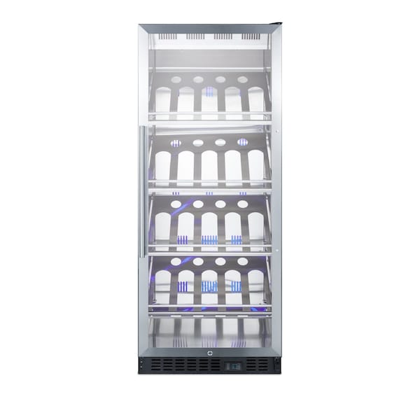 Summit Commercial offers a unique selection of wine cellars designed for optimum storage and bottle presentation. The SCR11561CH is an upright wine cellar built to meet NSF-7 commercial standards. The slim 24 inch footprint takes up minimum floor space, while the large 11 cu.ft. The self-closing stainless steel trimmed door includes a pro style handle and factory-installed lock for added security. This unit has a front-breathing cooling system that allows built-in installation, and a fully finished exterior that also enables freestanding use. It comes with a right hand door swing. Inside, the SC1156CH includes stainless steel shelving specially designed to hold champagne and sparkling wine bottles at a slight angle, providing a full display of the label. The interior walls and floor are constructed from stainless steel for lasting durability in busy commercial settings. This unit is illuminated through the rear walls with efficient LED lighting in a striking blue hue. The digital control panel offers a wide 36 to 68 Degrees F temperature range that allows you to program the optimum settings for red, white, or sparkling wine. The SCR1156CH comes with a fully finished jet black cabinet. Additional choices are available in stainless steel, as well as alternate sizes. Browse our website to explore our full lineup of commercially approved wine cellars.