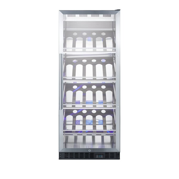 Summit Commercial offers a unique selection of wine cellars designed for optimum storage and bottle presentation. The SCR11561CHCSS is an upright wine cellar built to meet NSF-7 commercial standards. The slim 24 inch footprint takes up minimum floor space, while the large 11 cu.ft. The self-closing stainless steel trimmed door includes a pro style handle and factory-installed lock for added security. This unit has a front-breathing cooling system that allows built-in installation, and a fully finished exterior that also enables freestanding use. It comes with a right hand door swing. Inside, the SC1156CHCSS includes stainless steel shelving specially designed to hold champagne and sparkling wine bottles at a slight angle, providing a full display of the label. The interior walls and floor are constructed from stainless steel for lasting durability in busy commercial settings. This unit is illuminated through the rear walls with efficient LED lighting in a striking blue hue. The digital control panel offers a wide 36 to 68 Degrees F temperature range that allows you to program the optimum settings for red, white, or sparkling wine. The SCR1156CHCSS comes with a stainless steel wrapped cabinet. Additional choices are available in stainless steel, as well as alternate sizes. Browse our website to explore our full lineup of commercially approved wine cellars.
