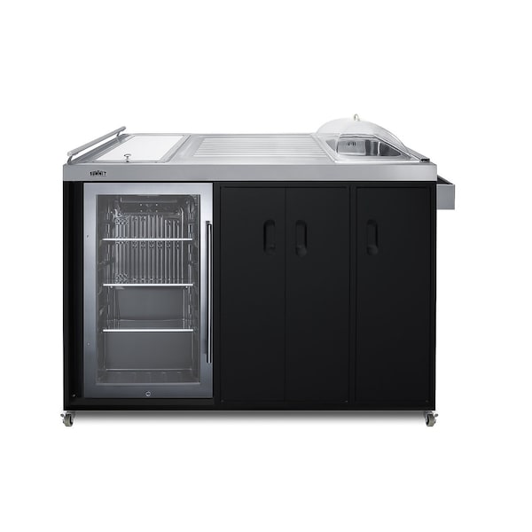 Bring new convenience to outdoor entertainment with Summit's fully featured selection of mobile outdoor kitchenettes. Model CARTOS54LG is a 58 inch wide mobile cart that comes fully featured for backyard entertaining. We include our popular outdoor beverage refrigerator model SPR488BOSADA for reliable, weatherproof beverage and condiment storage. The refrigerator features a glass door with a seamless stainless steel trim and front lock, allowing you to secure items when not in use.