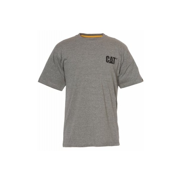 Caterpillar XXL Dark Heather Gray Short Sleeve Trademark T-Shirt is made of 6 oz. 100% cotton. It features wire management loop on outside back neck inside neck rib trim with spandex for shape retention tag-less back neck for comfort logo print on left chest and back and logo label on sleeve hem.
