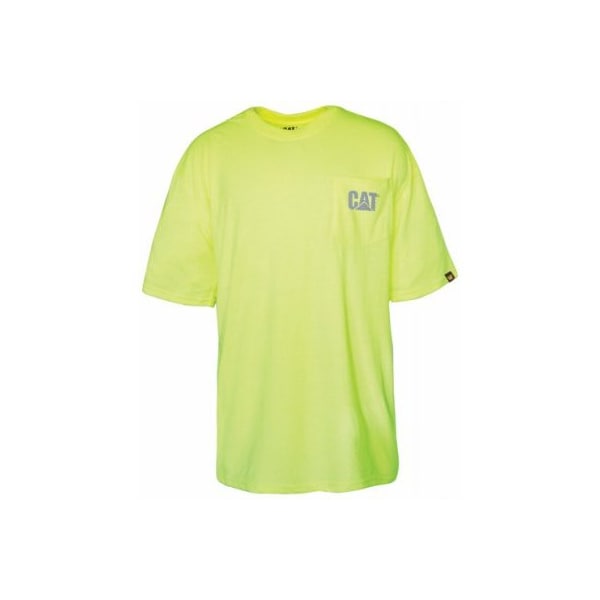 CAT Extra Large XL Hi-Visibility Yellow Short Sleeve Trademark Pocket T-Shirt. This 6 oz. hi-vis polyester jersey features moisture management fabric anti-odor technology inside neck rib trim with spandex for shape retention tag-less neck label for comfort reflective logo on left chest pocket & back and logo label on left sleeve hem.
