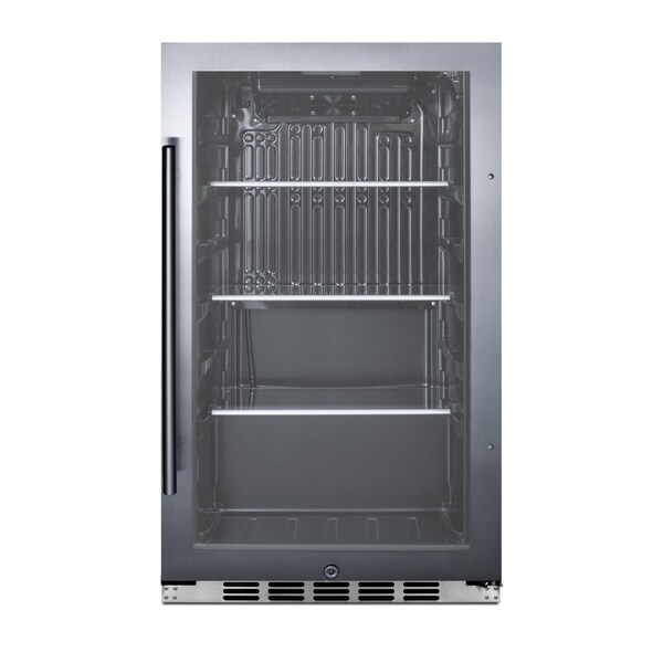 Summit's line of built-in undercounter outdoor appliances includes slim-fitting display beverage centers designed for optimum storage and product presentation. The SPR488BOSH34 features a versatile design that meets NSF-7 and UL-471 commercial standards, but is also approved for residential use. Sized with a slim 19 inch width and 17-3/4 inch shallow depth, it features a black cabinet with a sealed back for safe installation in the outdoors. The height can be adjusted between 33-7/8 and 34-1/2 inches to best suit your space. The user-reversible double pane tempered glass door features seamless stainless steel trim and a pro style handle. Customers supply their own handle to best match their setting. This unit is equipped with a right angle plug and integrated hinge for added space savings. Inside, the SPR488BOSH34 utilizes an internal fan to ensure the interior is evenly cooled from top to bottom, while the automatic defrost system allows for minimal user maintenance. LED lighting allows full visibility of stored items in the jet black interior. Three adjustable glass shelves with six positions provide optimal storage capacity inside the 3.1 cu. ft. interior. The dial thermostat, with seven temperature settings, is located in the upper-right corner for easy temperature management. The SPR488BOSH34 can be installed indoors or outdoors and is designed for built-in or freestanding use. Additional panel-ready choices are available in 15 inch, 18 inch, and 24 inch wide fits. Browse our full selection to find the perfect fit.