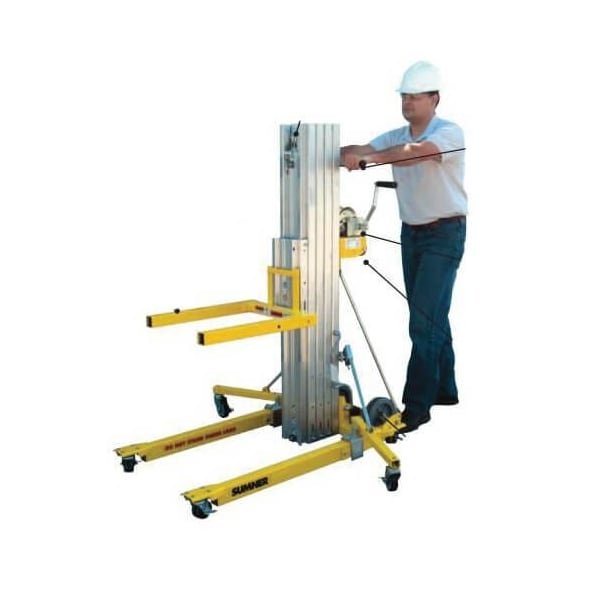 Sumner contractor's lift series: 2400, 450 lb load, 16 ft 11-3/8 in lifting height forks up, 15 ft 11-5/8 in lifting height forks down, 55-1/4 in OD base legs, 26-3/8 in ID base legs, 62-3/4 in height stowed, 55-1/4 in overall width, 48 in OAL, lockable caster.