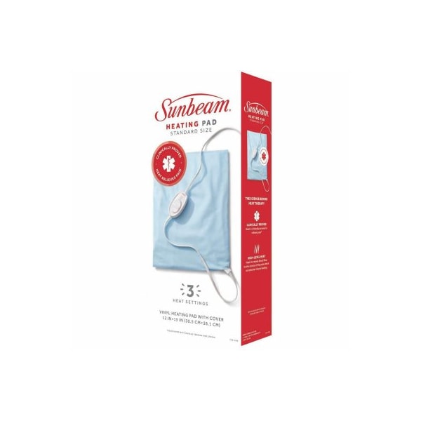 This Sunbeam Standard-Size Heating Pad delivers soothing heat therapy for common muscle pain and joint pain. The 12 x 15-inch pad covers most muscle groups to help accelerate tissue healing and relax sore muscles associated with muscle tension and stress. Customize treatment with 3 heat settings. Enjoy convenient features such as an easy-to-use slide controller designed for those with arthritis pain, a long 9-foot cord for added convenience and a moist heat sponge for optional deep, penetrating pain relief. The vinyl hot pad has a soft, machine washable cover for easy care.