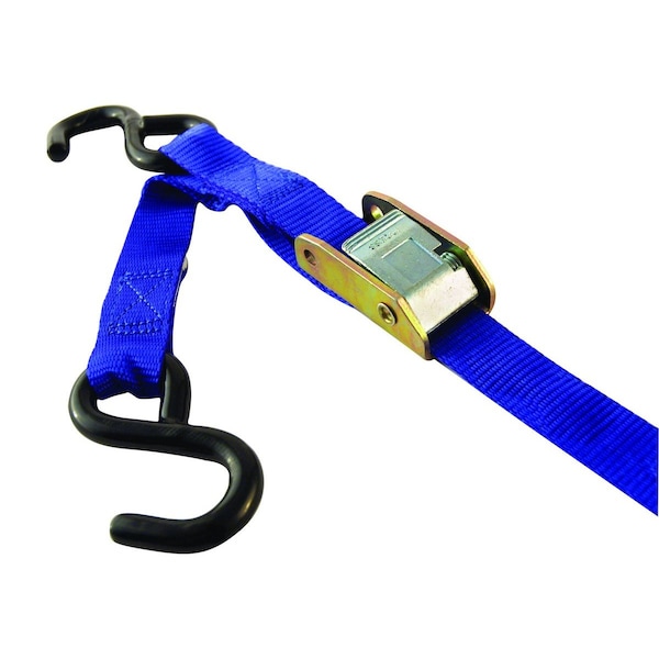 6' X 1" Standard Cambuckle, Blue Webbing, Hooks, Dim C (3): Coated Hooks, Nylon And Polyester Webbing, Engineered Stitching, Sewn Hand Holds, Zinc Or Nickle, Dim C (3): Plating That Is Designed To Work Or Play Hard, Dim A (1): Ease Of Operation For Motorcycle & ATV Owners, Dim B (2): Simple Tensioning With One Finger Release, Dim D (4): ME Series Increases Tensioning Power 2 To 1 With Innovative Engineering, Dim E (5): Break Strength: 900 Lbs., Dim F (6): Working Load Limit: 300 Lbs.