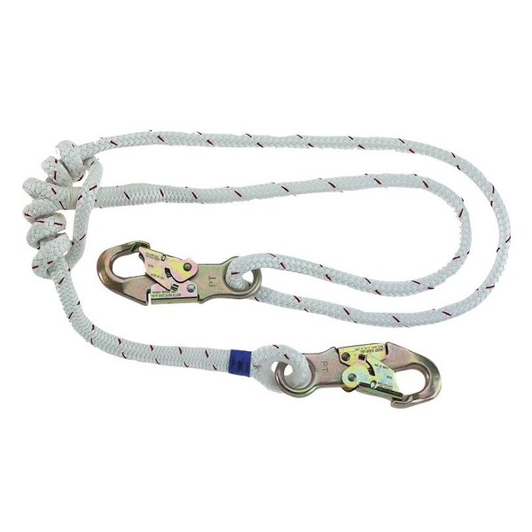 Lanyard, Adjustable, Double-Braid, 3' to 6', Notes 2: Locking snap hook each end, Construction: double-braid polyester, Diameter: 1/2", Tensile: Average: 10,100 lbf. Minimum: 8,850 lbf.