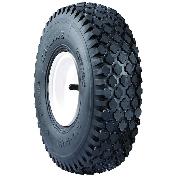 TIRE-STUD, 4.8/4X8, 4 PLY, Web Notes: The Carlisle Stud tire is used in many of the same small industrial product applications., Dim A (1): 5.8, Includes: Tire only (does not include rim), Maximum Load: 670, Maximum PSI: 42, Mounted Diameter: 16.3, Mounted Width: 4.7, Ply: 4, Rim Width: 3.75, Tread Pattern: Stud, Tread Style: Gripping Performers