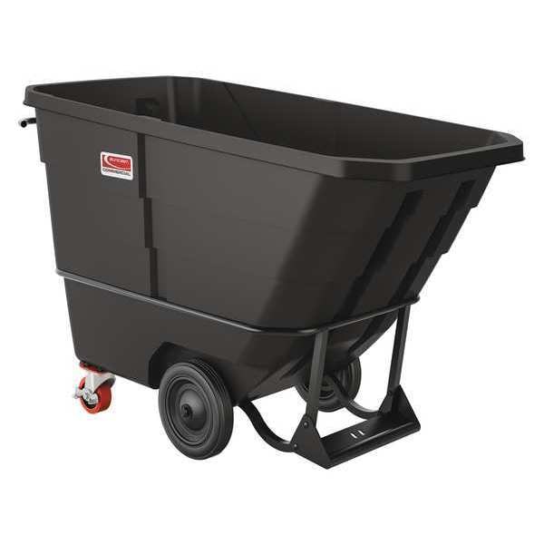 Tilt Truck, Cubic Foot Capacity 27 cu ft, Load Capacity 1,300 lb, Overall Length 70 in, Overall Width 33 7/8 in, Overall LxWxH 70 in x 33 7/8 in x 43 7/8 in, Overall Height 43 7/8 in, Optional Lid Mfg. Model No. RMTT100LID, Container Material Polyethylene, Color Black, Handle Type Flat, Mobility Option Forklift Capable, Manual, Towable, Caster/Wheel Configuration (2) Axle-Mounted, (2) Swivel with Brake, Caster/Wheel Mounting Location Standard, Caster Wheel Type Standard