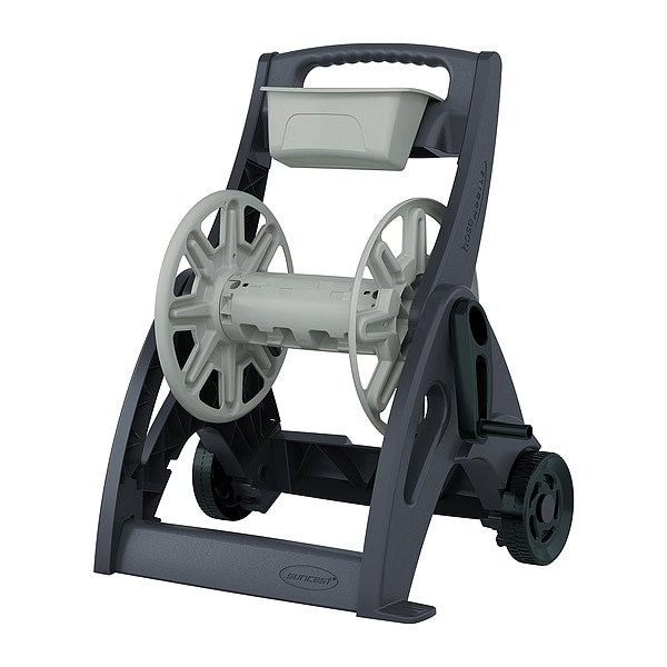 Garden Hose Reel, Garden Hoses, Hose Capacity 225 ft (5/8 in I.D.), Maximum Operating Pressure 150 psi, Reel Material Resin, Reel Color Tan, Hose Reel Type Free Standing Hose Reel, Includes Hose No, Overall Height 32 1/2 in, Overall Length 23 in, Overall Width 20 in, Includes Gooseneck No, Enclosed No, Swivel Outlet Gender Male, Swivel Outlet Size 1 in, Swivel Outlet Thread Size 3/4 in - 11 1/2, Swivel Inlet Gender Male