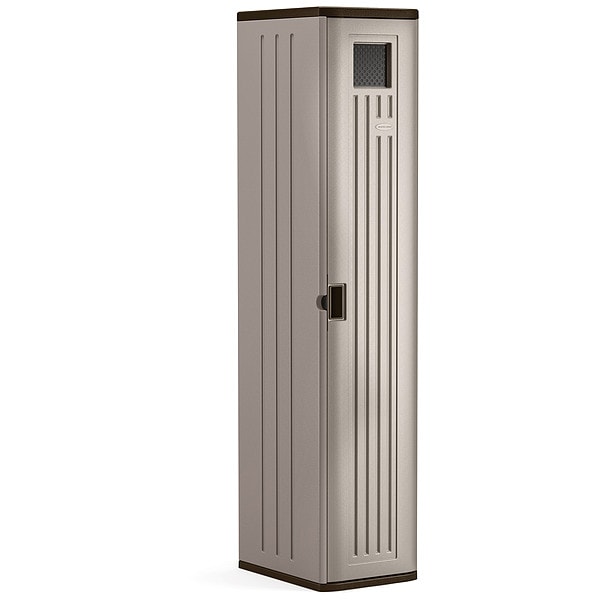 Plastic Storage Cabinet, Base Type Frame, Body Panel Type Solid, Cabinet Color Platinum Metallic, Cabinet Material Resin, Cabinet Storage Components Hanging Rods, Shelves, Door Handle Type Pull, Door Type Ventilated, Duty Rating Light Duty, For Use Indoors/Outdoors No, Frame Assembled Unassembled, Easy Assembly, minimal tools required, Load Capacity per Shelf 30 lb, Lock Type Padlock, Mobility Stationary, Mounting Location Freestanding, Number of Shelves 2, Overall Depth 20 in