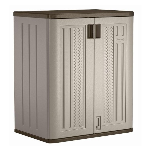 Storage Cabinet, Base Type Frame, Body Panel Type Solid, Cabinet Color Platinum/Slate, Cabinet Material Resin, Cabinet Storage Components Shelves, Door Handle Type Recessed Pull, Door Type Solid, Duty Rating Light Duty, Frame Assembled Unassembled, Load Capacity per Shelf 75 lb, Lock Type Padlock Hasp, Mobility Stationary, Mounting Location Freestanding, Number of Shelves 2, Overall Depth 20-1/4 in, Overall Height 36 in, Overall Width 30 in, Audit Trail Storage None