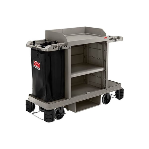 Housekeeping cart, standard plus with 4 premium rollers-hkc1550 the suncast commercial standard housekeeping cart is an innovation in commercial maintenance, with its sleek design and durable construction, know that this product is built to handle whatever job it faces. This cart features 3 standard independent non-marring rollers in all four corners to protect walls from costly damage and comes standard with one laundry bag, two vacuum holders, a traditional glass rack and integrated tool storage for cleaning supplies. Maximize storage capacity with additional bag designs or a handy caddy that is designed to nest over the laundry bag to allow for optimal top space workflow.