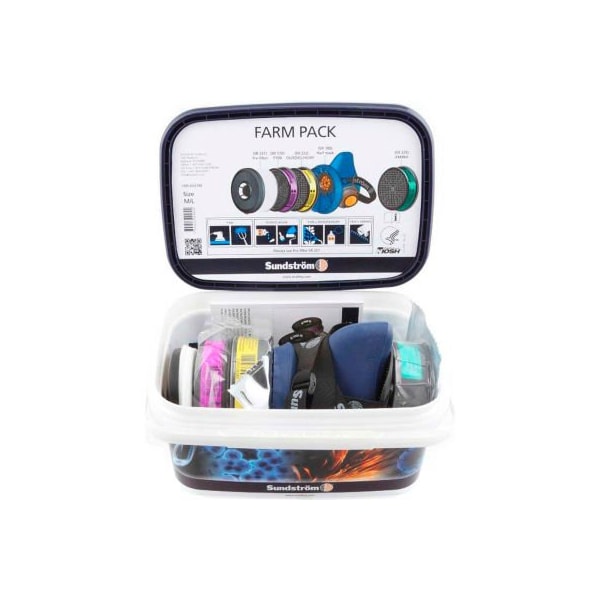Sundstrom farm pack l/xl, 1 each, h05-6521l a respiratory protection kit for the avid farmer covering applications ranging from pesticides, fertilizing, wood work, grinding, glue, mechanical repair, dust, hay, and more. The sr 100 silicone air purifying respirator is intended for use when maximum safety and breathing comfort are required. The heat-treated silicone material is fda approved offering a safe and comfortable fit that molds to the shape of your face. Extremely low breathing resistance makes this mask optimal for low to strenuous work activates. One farm pack includes everything you need. features: sr 100 l/xl half mask respirator (1) sr 232 chemical cartridge ov/sd/cl/hc/hf (1) sr 229 chemical cartridge am/ma (1) p100 particulate filter (10) sr 221 prefilters prefilter holder sr 5226 cleaning wipes
