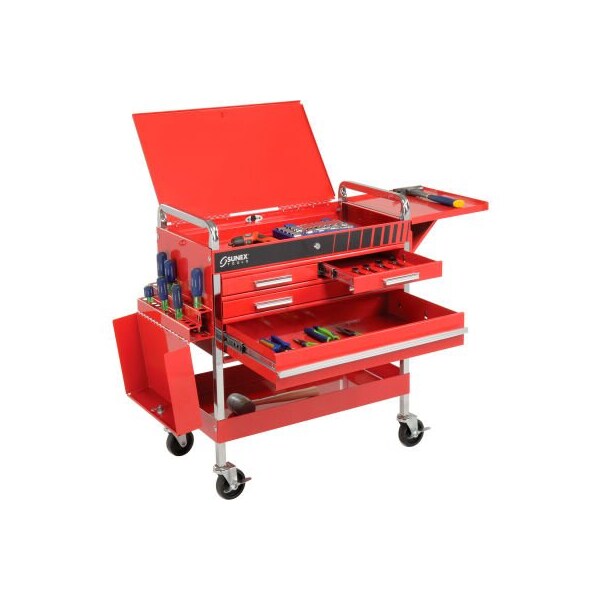 Sunex deluxe service cart provides high volume tool storage in automotive garages, workshops, repair centers and other industrial work areas. sunex deluxe service cart is made of heavy gauge steel with powder coat finish for lasting durability. Four storage drawers extend fully on roller bearing slides for complete access to tools. Drawer sizes are (3) 2"d and (1) 4"d. flip top locking top compartment and 3" deep open bottom shelf provide additional room for bulky items. Locking screwdriver/pry bar holder increases storage capacity. Side work shelf provides additional space for assembly instructions, forms or other paper work. 4" casters (2 locking) and chrome handles add mobility. Color finish is red .