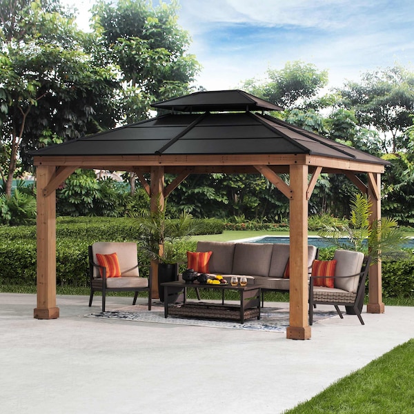 Transform your backyard into a four-season destination with the SUNJOY 11x13 Hardtop Gazebo. Crafted from rich, natural cedar and crowned with a matte black galvanized steel roof, this structure is built to last-and built to impress.Its oversized 5.5" x 5.5" posts deliver a commanding presence and rock-solid stability, while the heavy-duty roof shields against sun, rain, and snow with ease. A vented double-tier design encourages airflow, keeping the space beneath cooler and more breathable-ideal for hot summer afternoons or post-grill evenings.Designed with flexibility in mind, it features built-in curtain rails and a ceiling hook so you can easily add netting, drapes, or lighting. Whether you're creating a cozy dinner space, a shaded lounge, or a stylish cover for your hot tub, this gazebo adapts to your lifestyle with elegance and strength.With pre-drilled parts, labeled hardware, and detailed instructions, assembly is straightforward-even for weekend DIYers. For those who expect more from their outdoor space, this SUNJOY cedar gazebo delivers timeless beauty and year-round performance in every detail.