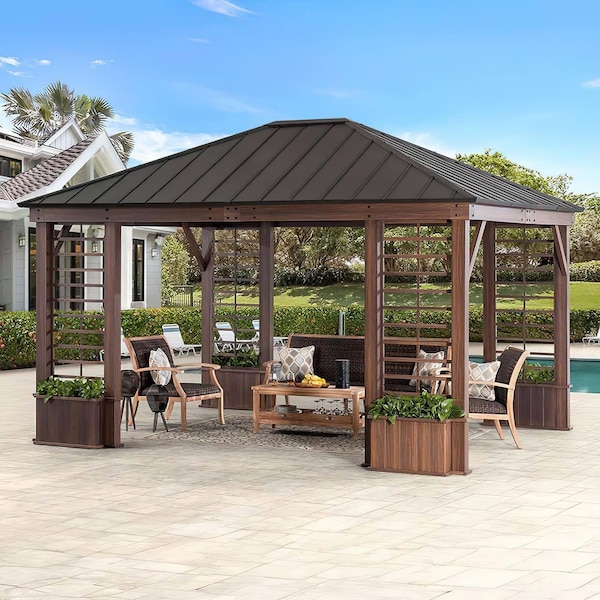 Expand your living space by bringing the indoors outside and creating your end-of-the-day oasis thats the perfect spot for entertaining family and friends. This 13.3 ft. x 14.8 ft. gazebo by the worlds leading ready-to-assemble outdoor structure maker, Sunjoy, creates the perfect outdoor setting for any time of the year. Spend all four seasons enjoying a covered spot outdoors under the natural wood looking frame made of rust-proof aluminum and rust-resitant galvanized steel. The four built-in planters are the perfect place to add greenery or florals during warmer months for color. Use them to hold dried corn stalks or wheat bundles for some autumnal decor. Set the mood by suspending a chandelier from the incorporated ceiling hook for additional functional light and high design. With straight-forward, easy-to-follow assembly instructions youll be relaxing with your beverage of choice in your favorite new outdoor living space for years to come.