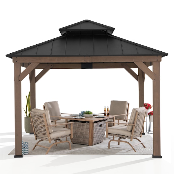 Expand your living space by bringing the indoors outside and creating your end-of-the-day oasis that's the perfect spot for entertaining family and friends. This 11x11 wooden gazebo by the world's leading ready-to-assemble outdoor structure maker, Sunjoy, creates the perfect outdoor setting for any time of the year. Spend all four seasons enjoying a covered spot outdoors under the chestnut-color cedar wood frame with a brown sturdy powder-coated steel roof top that will stand the test of time. The 2-tier roof provides just the right amount of airflow while keeping occasional inclement weather at bay. Set the mood by suspending a chandelier from the incorporated ceiling hook for functional light and high design. With straight-forward, easy-to-follow assembly instructions you'll be relaxing with your beverage of choice in your favorite new outdoor living space for years to come.