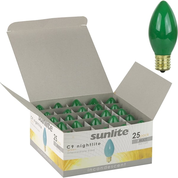 Sunlite's colored decorative C9 light bulbs are the perfect decorative bulbs for the holiday season and beyond. This Sunlite 120 volt, 7 watts, C7 night-light provides a nice light output of 25 lumens. It features an E17 intermediate base and can last up to 1,500 hours. They come in a variety of colors; Blue, Green, Red, and White. Add to the dcor of any space with a splash of colored light and create a festive scene.