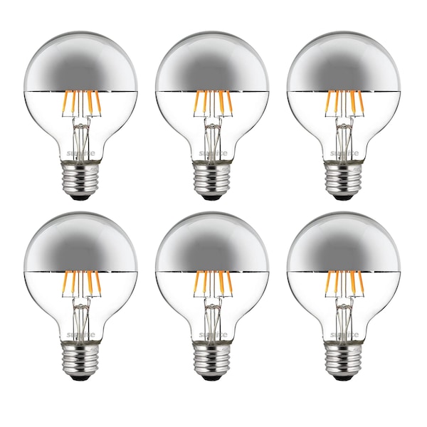 Upgrade your lighting with Sunlite Dimmable LED bulbs. With a G25 globe shape and medium E26 base they are an energy efficient replacement for 60 watt incandescent while only using 6 watts of electricity. They are instant-on at full 530 lumen brightness. With an average life of 15000 hours these long life bulbs need to be replaced less often. The estimated annual energy cost is a low $0.72 Based on 3 hr/day use at $0.11 per/kWh. These 2700 Kelvin warm white light bulbs provide a comforting warm glow that can be adjusted with a dimmer for perfect lighting. Color Rendering Index CRI of 85 and a 360-degree beam angle. The half chrome design reflects the light back into its fixture, giving you the perfect amount of light with a glare free resolution. Tested compatible dimmers: Lutron DVELV-300P MAELV-600 SELV-300P