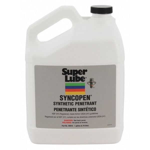 Penetrating Lubricant, Super Lube, Syncopen, Net Fill 1 gal, Container Size 1 gal, Jug, Synthetic Oil, Min. Operating Temp. -30 Degrees F, Max. Operating Temp. 200 Degrees F, H1 NSF Rating, Yes 50 State VOC Compliant, Colorless, Odorless No, Non-Flammable, Non-Flammable, Flash Point 205 Degrees F, NSF Registered, Category Code H1, ASTM D1298, ASTM D97, ASTM B117, ASTM D130, USDA Rating, Not Applicable Military Standard, USDA Certified Biobased Product USDA Certified Biobased Product
