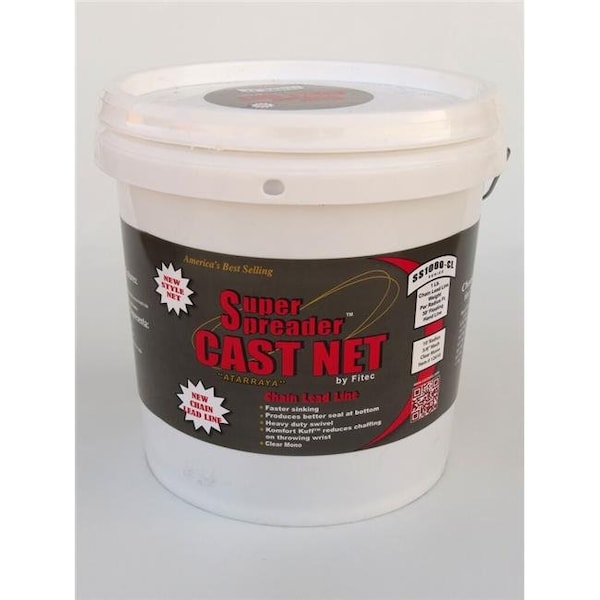 Now you can land your prize catch when you use the Fitec SS-1000 Super Spreader Cast net made of clear monofilament netting for durability and lasting use. The bullseye design helps secure fish and the included throwing aid and Komfort Kuff offer increased accuracy. This fishing cast net sinks faster into the water and provides a tight bottom seal so fish can't escape once inside. It also has a stronger net with a more secure closure on retrieval. A high floating 26-foot long braided polyethylene hand line is included. 10 ft.x 1 in. Mesh, S1000-CL Chain Leaded Cast Net Clear, 1 lb wt.