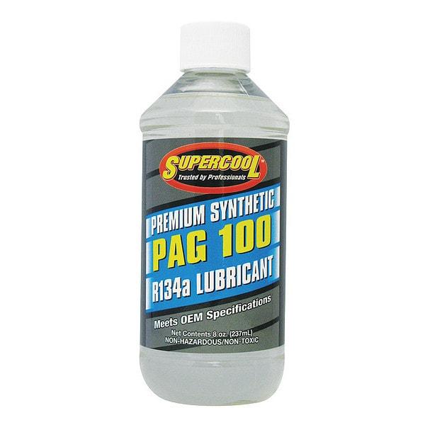 A/C Compressor PAG Lubricant, Compatible Refrigerant Systems R-134a, Container Type Bottle, Container Size 8 oz, Compatible Lubricant PAG Lubricants, Color Yellow, PAG Viscosity Grade PAG 100, Viscosity Index 100, Standards ANSI-ASHRAE 97-1989, ASTM D1401, ASTM D2270, ASTM D2783, ASTM D4052, ASTM D445, ASTM D92, ASTM D97, ASTM D972, ASTM D974, ASTM E203, FZG, Modified IP48, Product Type PAG Oil, Additives Included Anti-Wear Additives, Boiling Point 392 Degrees F, Container Material Synthetic