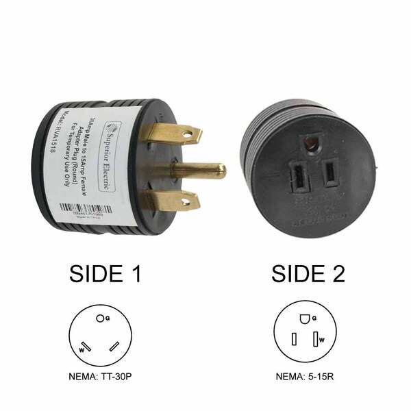 Superior Electric RVA1518 30 Amp Male NEMA TT-30P to 15 Amp Female NEMA 5-15R Adapter Plug (Round).