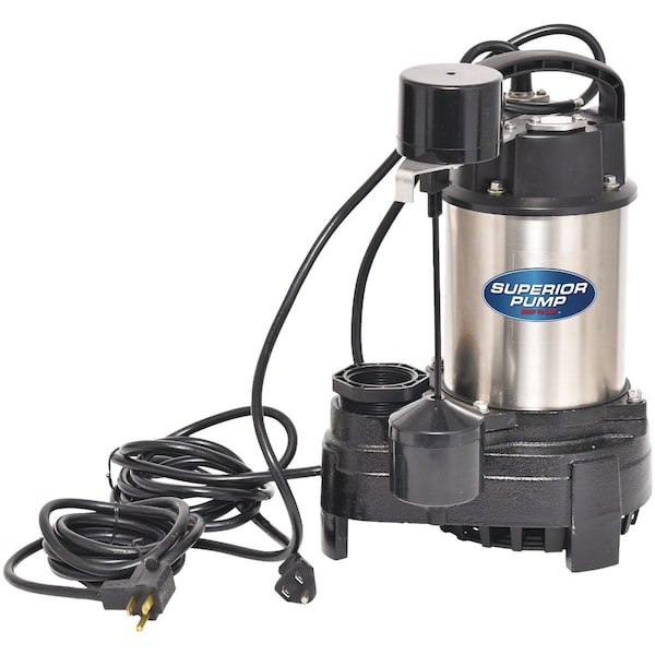 Superior Pump builds pumps that are truly built to last and are 100% factory tested. Superior Pump uses quality components including solid copper motor windings heavy-duty stainless steel jacketed shaft seals double o-ring seals on motor plate and electronically controlled split capacitors. Superior Pump submersible sump pump with vertical float switch pumps water up to 25 vertical feet. Side discharge. 10 Ft. cord length.