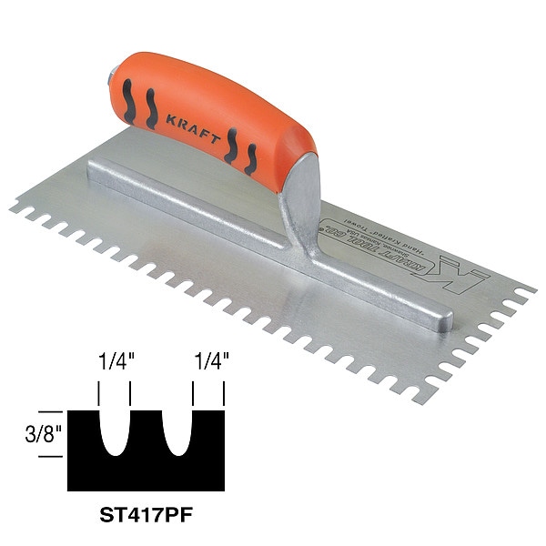 Trowel, Blade Length 11 in, Blade Material Carbon Steel, Blade Shape Square, Blade Width 4 1/2 in, Compatible Primary Material Adhesive, Mortar, Handle Length 5 in, Handle Material ProForm, Handle Style Camel Back, Notch Depth 3/8 in, Notch Shape U, Notch Spacing 1/4 in, Notch Width 1/4 in, Product Type Trowel