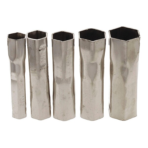 Socket Set 5 Piece, Steel, 6-Point Flare Nut, Wrench Size 1 1/32 in, 1 11/32 in, 1 3/32 in, 1 5/32 in, 1 7/16 in, 1 9/32 in, 21/32 in, 27/32 in, 29/32 in, 31/32 in, Longer Length for Hard to Reach Valves. Nickel Plated Steel. Includes Bar Handle for Easy Storage, Removal of Recessed Tub and Shower Valves
