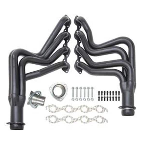 Features -Standard duty hi-tech coating -18 gauge mandrel bend -Ceramic metallic coating protects headers against heat up to 1400 degree fahrenheit -Resists corrosion caused by environmental factors such as rain road salts and oxidation -Insulating properties of this finish keeps exhaust gas heat in the tubes which speeds up gas flow and protects underhood components from excessive heat Specification -Style - Full length -Exit location - Chassis exit -Flange type - Standard -Flange thickness - 0.25 in. -Collector diameter - 3 in. -Color - Silver -Material - Steel -Primary tube diameter - 1.75 in. -1965-1977 chevrolet