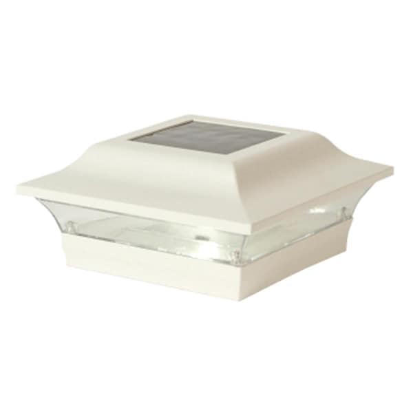 Unequalled in performance the rugged cast aluminum 5inx5in Imperial solar post cap is designed using 3 high output LED s to provide a brilliant white light with contemporary design. The powder coated finish means no future painting. - High Performance solar lights stays lit for up to 10 hours- Lights up automatically every night auto off switch- 3 High output LED s for brilliant white light- Manufactured from durable cast aluminum- Will fit over an actual 5inx5in PVC - Patent No. D624 227S-Color: White-Item Length: 7-Item Height: 3.25-Item Width: 7