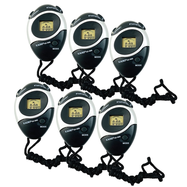 This electronic, LCD display, stopwatch features hour, minute, seconds display, calendar display, 24 hour stopwatch, alarm, hourly chime, 12 or 24 hour mode options, 1/100 second chronograph, split time and total time. Timed with Quartz movement to an accuracy of 0.01s. Lightweight and easy to operate. Comes complete with battery and carry cord. For Age 7+. Sold as a pack of 6 stopwatches.