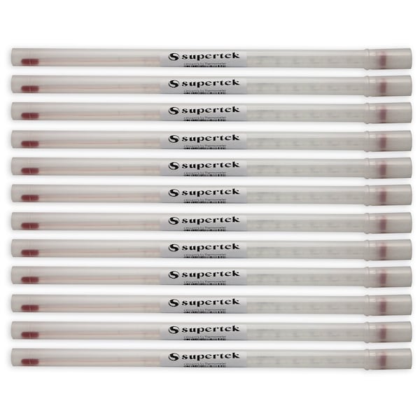 This student grade red liquid thermometer is etched with 1 degree increments. Thermometer is shaped with an anti-roll triangle and is housed in a convenient re-usable plastic storage tube. White back 11-3/4 long. -20 to 110 C, 0 to 230 F, Partial Immersion Thermometer. Ages 13+. Sold as a pack of 12 thermometers.
