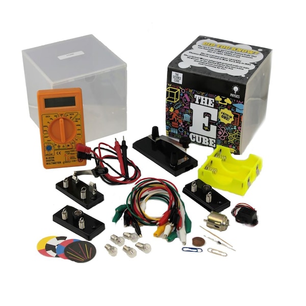 The E Cube has Everything from our 4 most popular kits: Telegraph Kit, Color Theory, Simple Circuit and Conduction Experiment. Explore many aspects of electricity and take it to the next step with our digital multi-meter. Have fun recording your results and design your own experiments as you ask, I wonder what would happen if. There are no limits!
